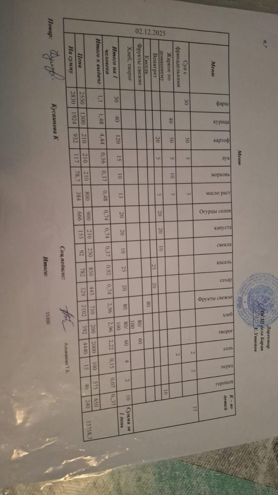 Бір күндік ас мәзірі 02.12.2025