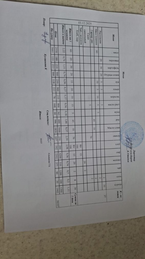Бір күндік ас мәзірі 03.12.2025