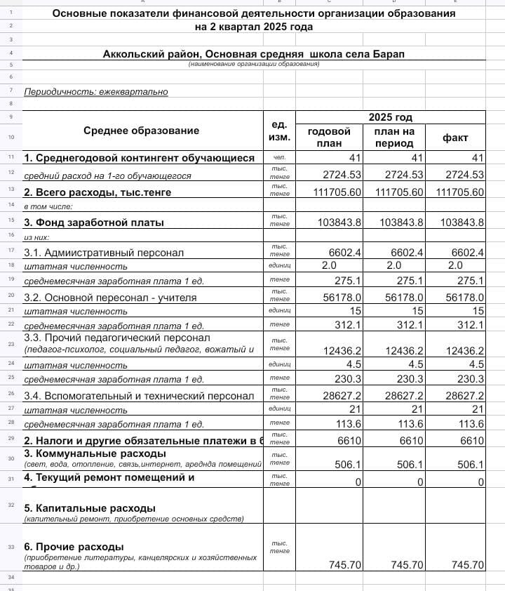 2025 жылдың 2 тоқсанына Барап ауылының негізгі орта мектебінің қаржылық қызметінің негізгі көрсеткіштері